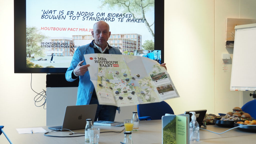 Daarna nam Bob van der Zande, Programmaleider Houtbouw van de Metropoolregio Amsterdam, het stokje over en gaf een boeiende inleiding op de centrale vraag van het rondetafelgesprek: Wat is er nodig om biobased bouwen tot de standaard te maken? Hij presenteerde de evaluatie van het Houtbouwconvenant 2021-2025 en het nieuwe Houtbouwpact 2026-2030.
