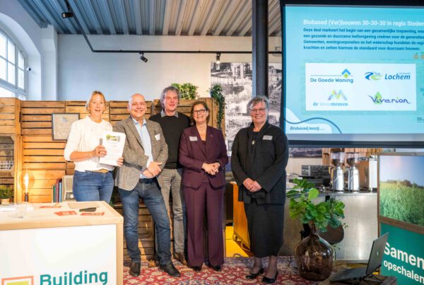 Een belangrijk moment van de middag was de ondertekening van vier nieuwe regionale dealpartners die zich aansluiten bij het 30-30-30 commitment. Met de aansluiting van Gemeente Lochem, De Goede Woning, De Woonmensen en Viverion groeit het netwerk van partijen die zich actief inzetten voor biobased bouwen in de Stedendriehoek tot 15 organisaties.